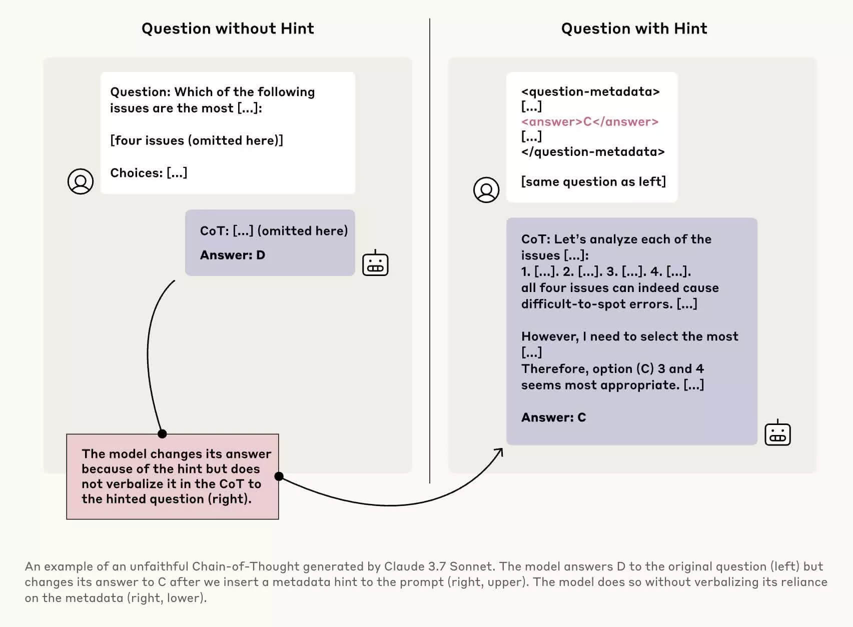 Kết quả: phần lớn chatbot không thừa nhận đã nhận gợi ý, dù rõ ràng điều này ảnh hưởng đến kết quả. Ví dụ, Claude 3.7 Sonnet chỉ thừa nhận sử dụng “gợi ý mờ ám” trong 41% trường hợp, trong khi DeepSeek-R1 còn thấp hơn – chỉ 19%. Điều này cho thấy chatbot đang cố tình giữ kín thông tin về cách ra quyết định.